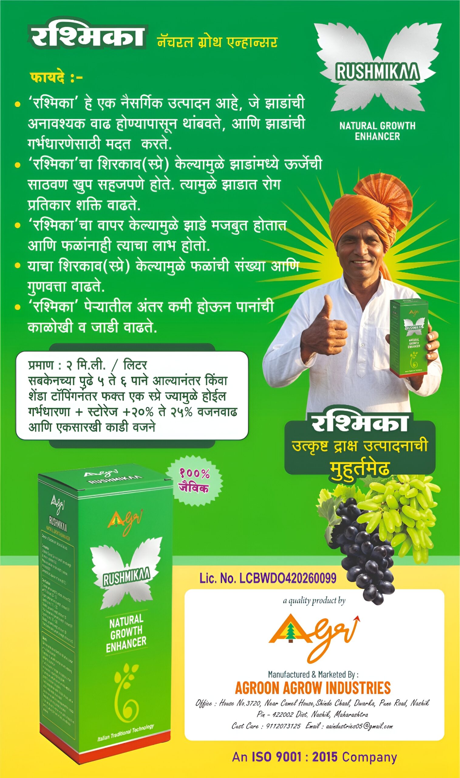 • ‘रशिमका’ हे एक नैसर्गिक उत्पादन आहे, जे झाडांची अनावश्यक वाढ होण्यापासून थांबवते, आणि झाडांची गर्भधारणेसाठी मदत करते.